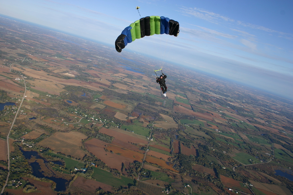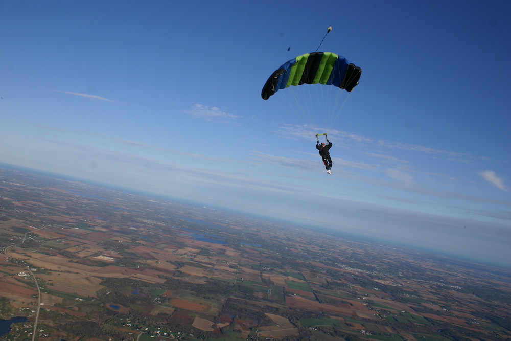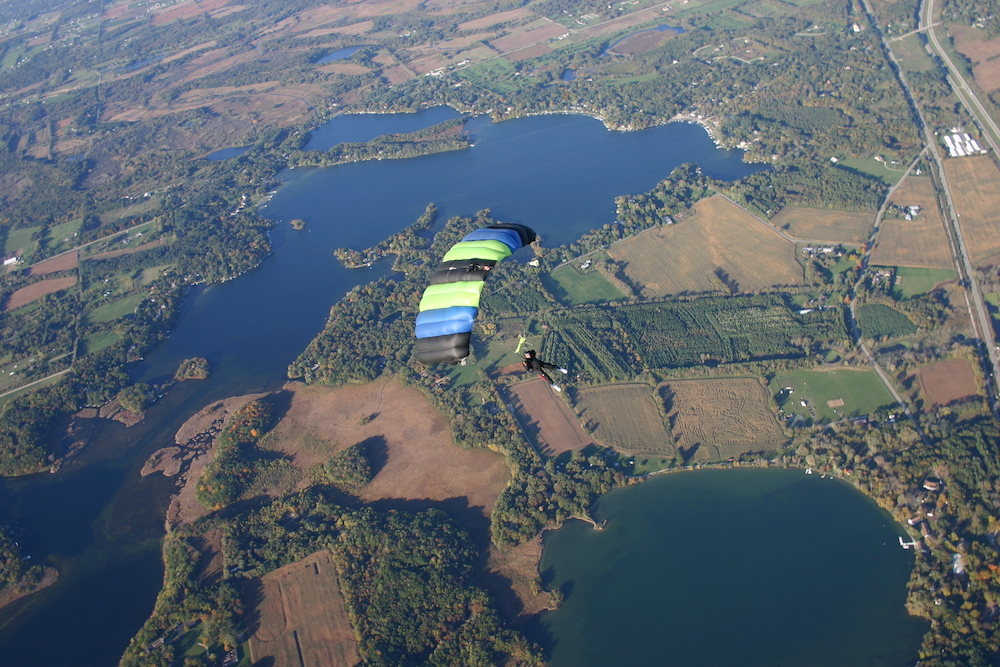 CRW dog Brian Martin was tapped to take pictures. We exited the PAC750 at about 6,000 feet. I got stable and deployed the parachute. I opened with a single line twist but otherwise great. I collapsed the slider by pulling forward on the tabs, then unstowed the toggles which were now on the front of the risers. Just then, Brian showed up and flew in formation with me. It was quite bizarre us to be flying face-to-face.