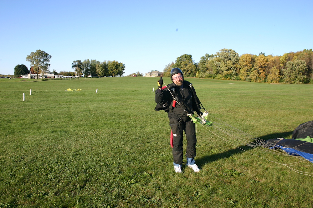 I had intentionally waited for a breezy day so that my forward (backward) ground speed would be minimal on landing. Of course, when I landed the winds had died considerably. My flare was a touch late and my feet hit the ground a little sooner than I had expected. I quickly decided a reverse PLF was in order and unavoidable. It wasn't graceful, but I came out unscathed. Just like my student days, I hopped up and let the assembled crowd know that I was uninjured.